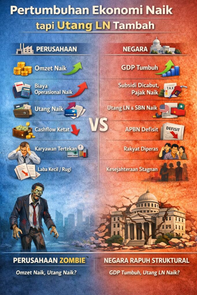 Kondisi inilah yang patut dicermati dalam konteks Indonesia. Pertumbuhan ekonomi 5,04 persen tidak otomatis menempatkan negara dalam posisi “untung”. Apabila pertumbuhan tersebut dicapai melalui defisit anggaran yang berulang, pembiayaan utang yang semakin besar, serta tekanan fiskal terhadap dunia usaha, maka secara struktural negara justru berada dalam kondisi rapuh. Ketika ruang fiskal menyempit dan biaya ekonomi meningkat, dunia usaha akan merespons dengan langkah efisiensi, dan PHK menjadi pilihan yang tak terhindarkan.